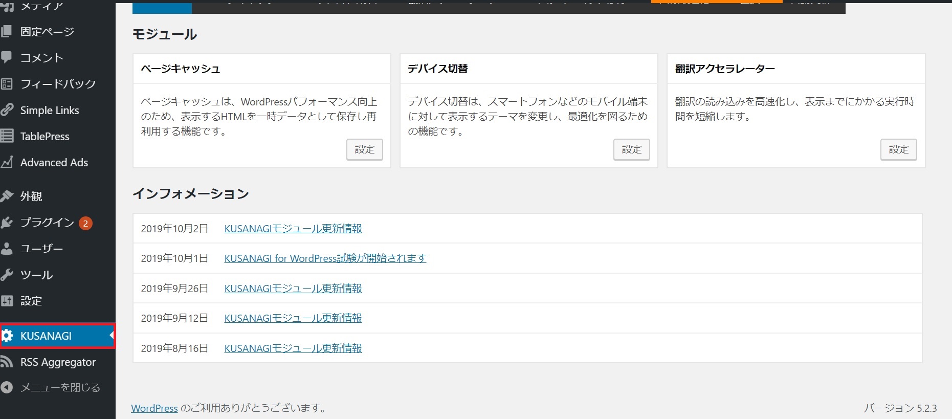 1,wordpress管理画面から「KUSANAGI」の設定画面に入る